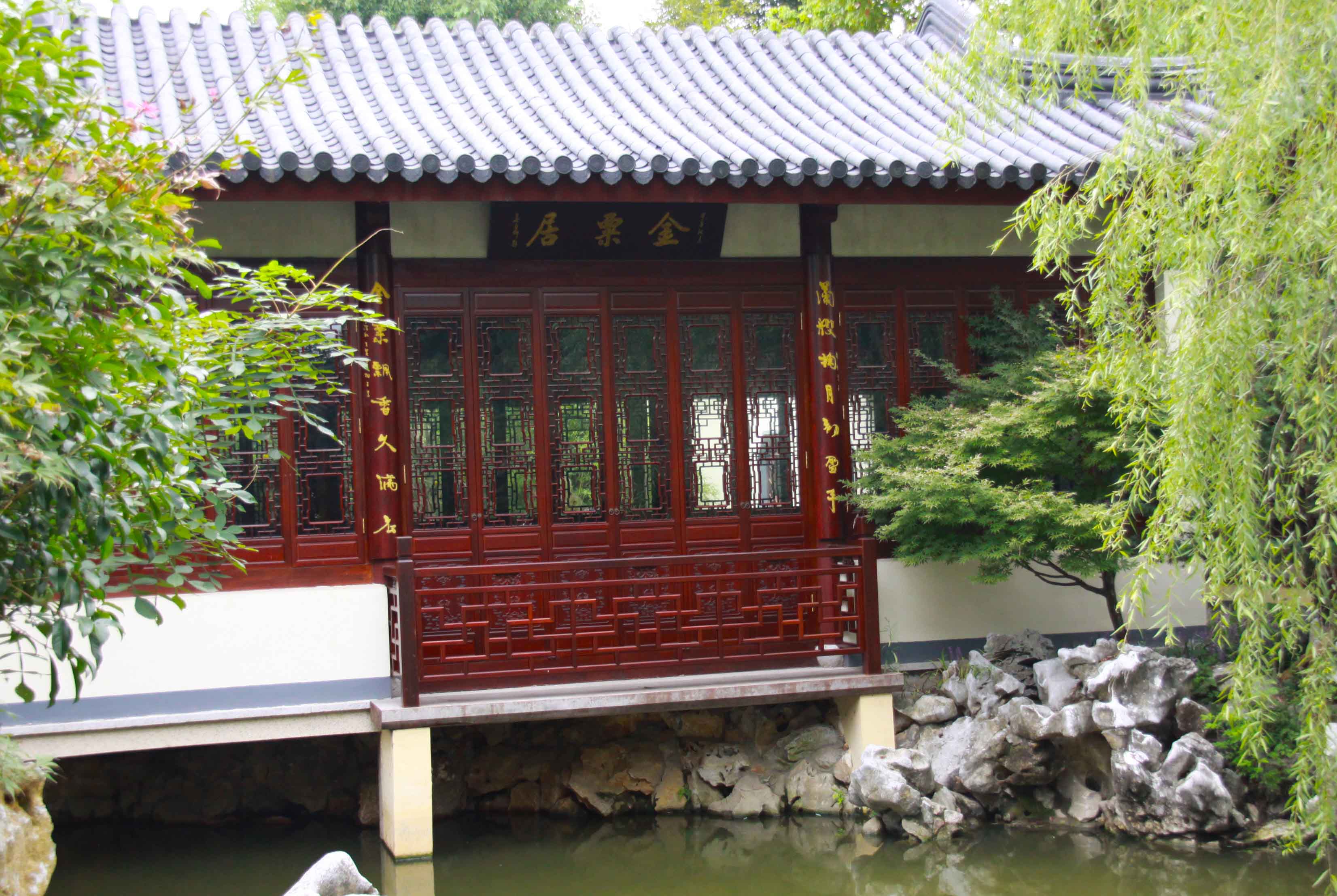 進(jìn)月洞門(mén)向前有小徑可達(dá)桂舫,向左則為一小庭院,院內(nèi)有桂樹(shù)及湖石孤峰,故名“金粟居”,三開(kāi)間書(shū)房架池而建,立于水面之上,環(huán)境幽美清朗,落地窗的室內(nèi),置紅木畫(huà)案書(shū)架,蘇作明式家具,簡(jiǎn)潔精致,靜雅墨香?!昂惨萆耧w”橫匾點(diǎn)明了此間為揮毫潑墨之雅室。
