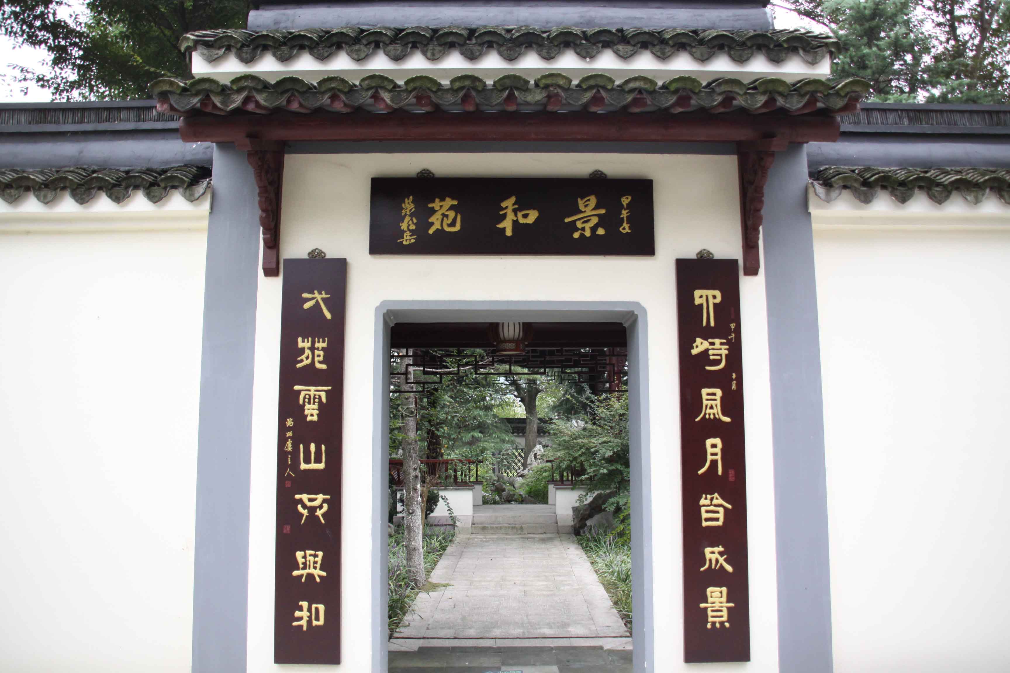 步入園內(nèi),右側(cè)圍墻有門(mén)洞開(kāi),上有“景和苑”匾額,取“春和景明”句意,由原浙江省省長(zhǎng)柴松岳題寫(xiě)。進(jìn)門(mén)以迴廊花窗將沁檀園分割成東西兩園,西園以疏朗自然見(jiàn)長(zhǎng)。
