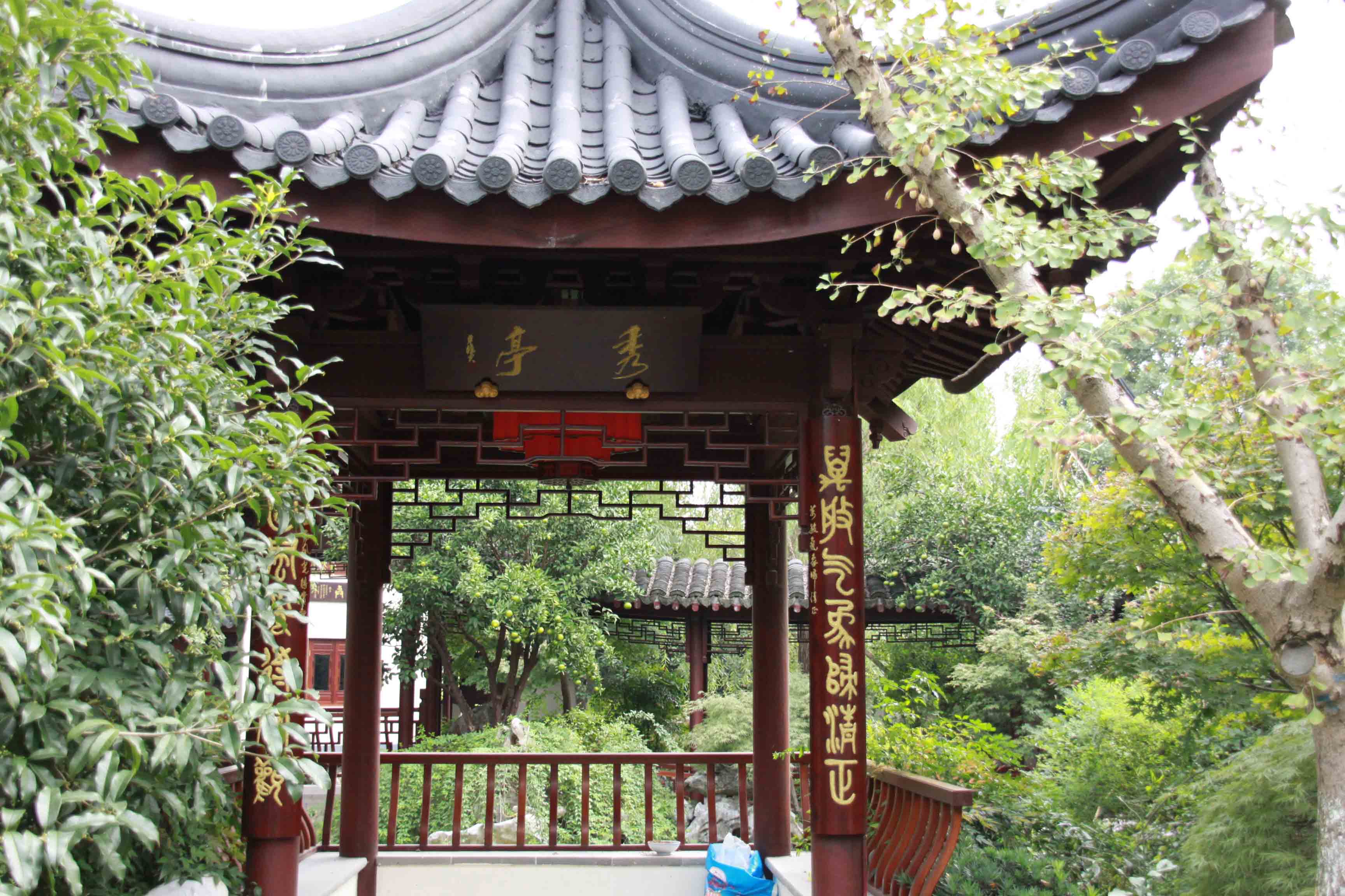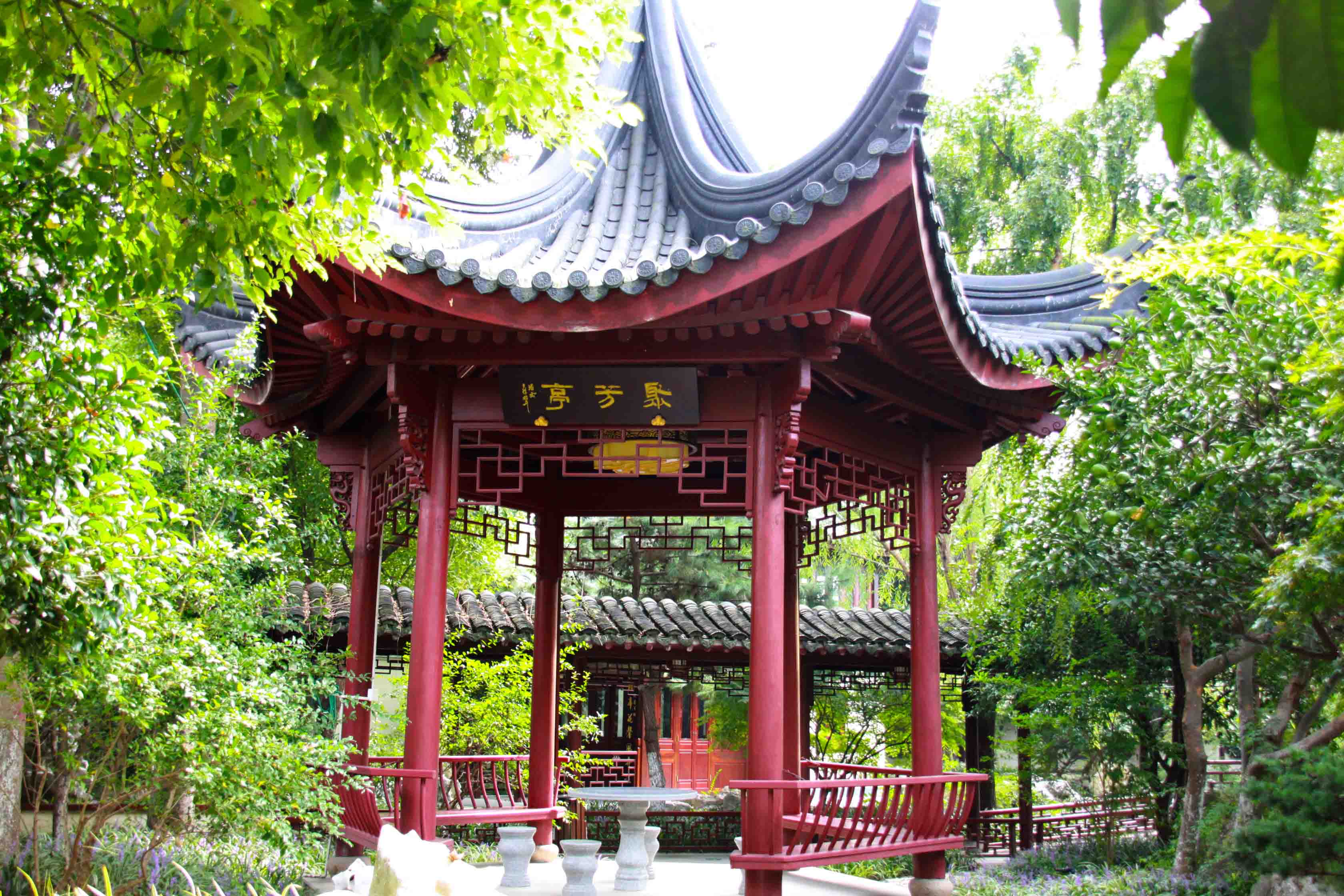 園內(nèi)建有 “具美亭”一座,四周綠草如茵,林木疏朗。亭位居正中,為四角攢尖,造型方正大氣,“三才相匯存真趣,四美咸臻促朗吟”亭聯(lián)為浙江詩(shī)人吳亞卿所撰,將匯才之名,景色之美嵌入其中?!熬呙劳ぁ本吧臅r(shí)具美,又意紅木家具之美,一語(yǔ)雙關(guān),可見(jiàn)匠心。