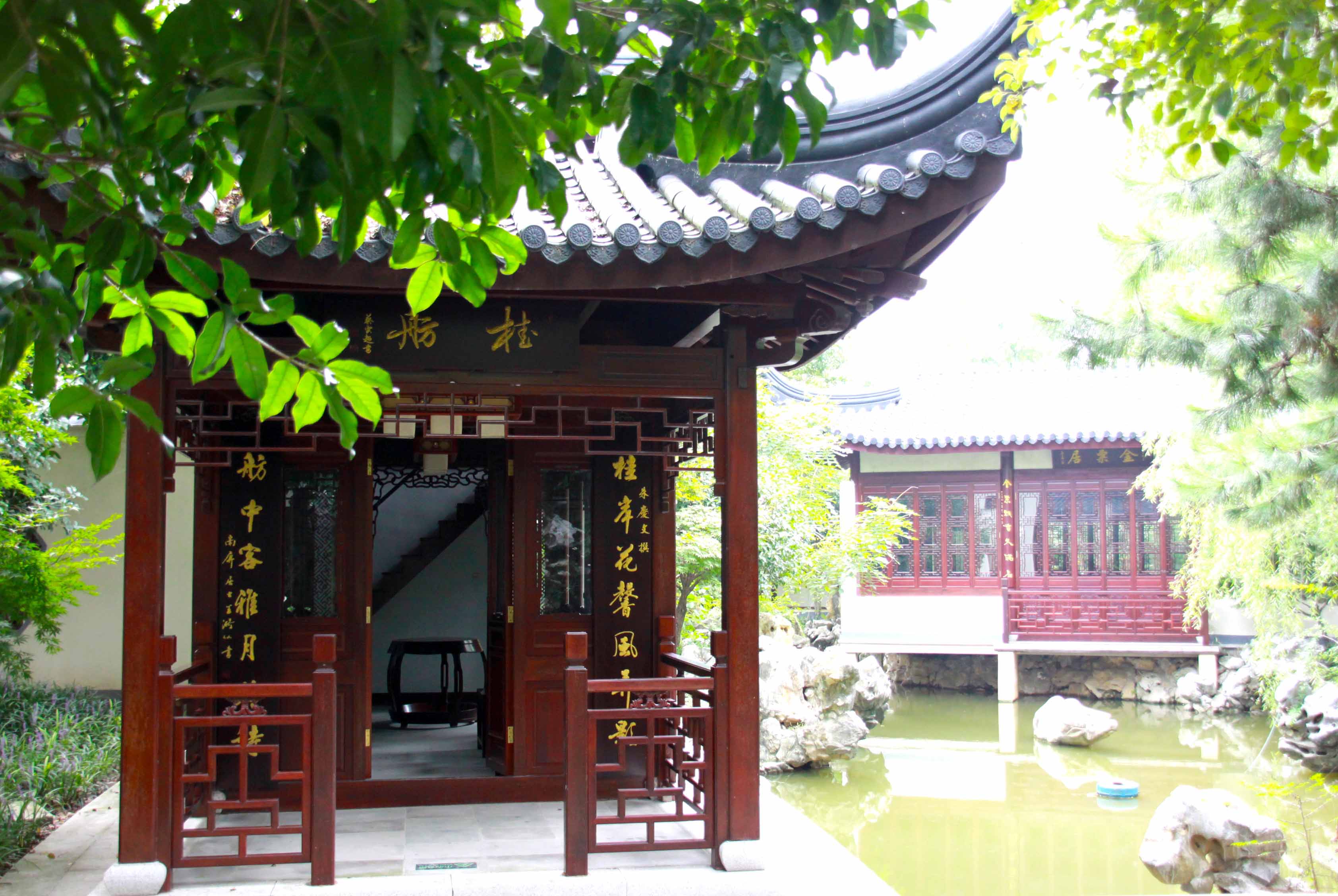 縱觀“沁檀園”景色,小中見(jiàn)大,虛實(shí)變化,園中樓堂亭閣,廊橋曲徑,顧盼相生。園中安放簡(jiǎn)潔精雅的蘇作紅木家具,配以名人書(shū)畫(huà)、匾額楹聯(lián)、山石盆栽、瓷器文玩,讓秀美風(fēng)光與典雅人文氣息更加完美結(jié)合。使“沁檀園”成為完美體現(xiàn)中國(guó)園林“巧”、“宜”、“精”、“雅”四字基本品格特征的一座江南新園林。